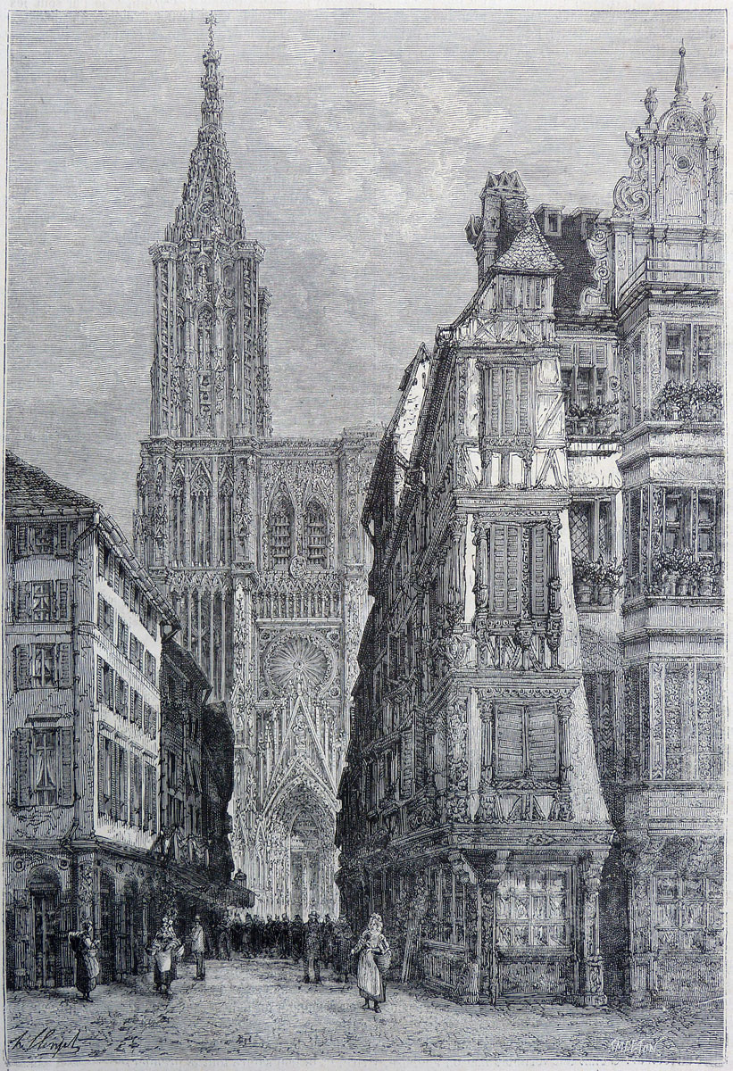Gravure représentant les vieilles maisons de la rue des Merciers à Strasbourg. A droite, une maison médiévale à colombage biscornue et des échoppes au rez-de-chaussée. La rue est animée, de nombreuses personnes circulent à pied. Au fond de la perspective, la cathédrale gothique de Strasbourg et son clocher unique surmonté d'une flèche.