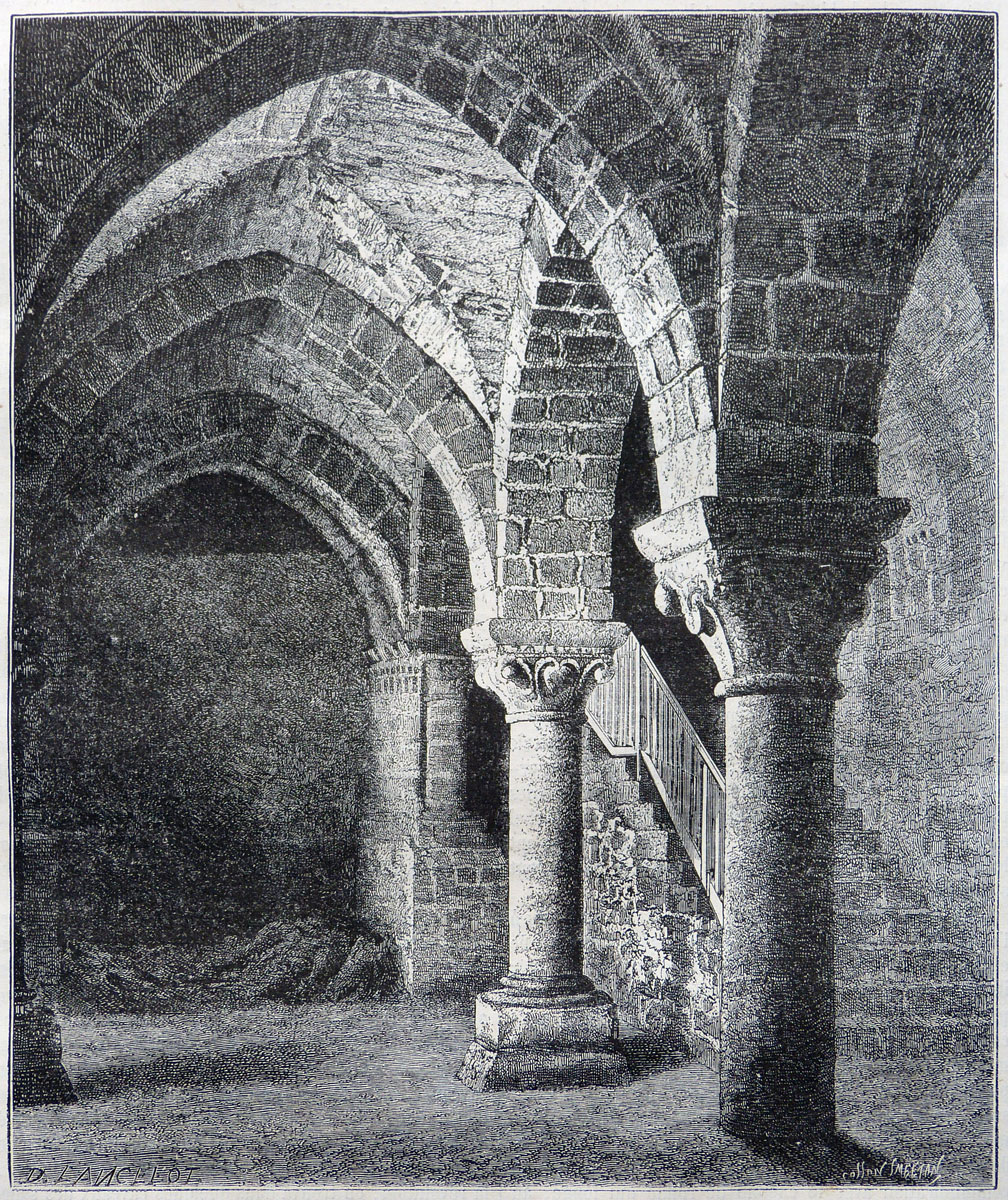 Salle inférieure des bâtiments de la Merveille au Mont-Saint-Michel. De fortes colonnes romanes supportent des voûtes aux arcs brisés. L'ensemble est dimensionné afin de supporter les niveaux supérieurs. Un escalier arrive du niveau supérieur dans un des angles de la salle. Le Mont-Saint-Michel est inscrit au patrimoine mondial de l'UNESCO.