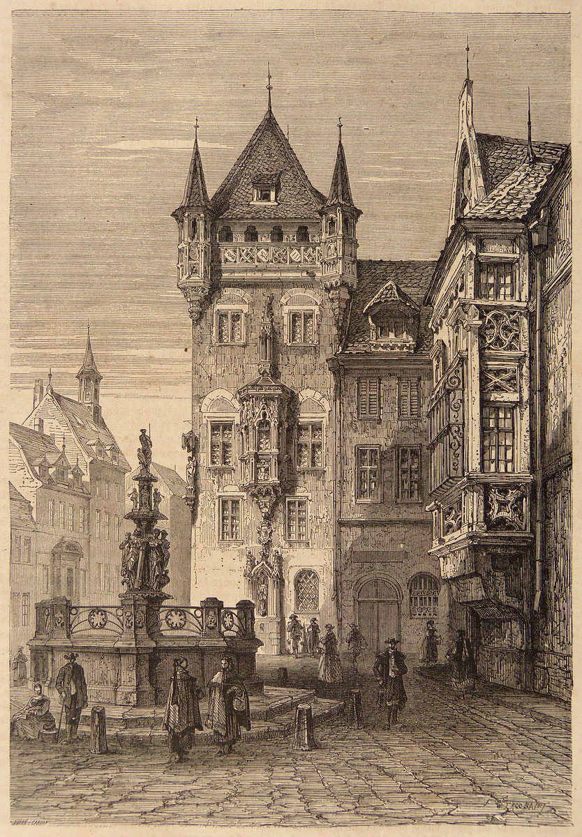 Vue d'un des bâtiments emblématiques de la ville de Nuremberg (Allemagne), la maison dite "de Nassau", une habitation fortifié sous forme de tour. Construite à partir du XIIIe siècle dans le style roman, elle est ensuite agrémentée d'éléments gothiques tel le balcon et les tourelles en parties haute. Au premier plan, sur une place couverte d'un imposant dallage, la fontaine des vertus représente les vertus sous l'aspect de six femmes au dessus desquelles est figurée la justice. Sur les côtés on devine des maisons à colombage du Moyen-âge.