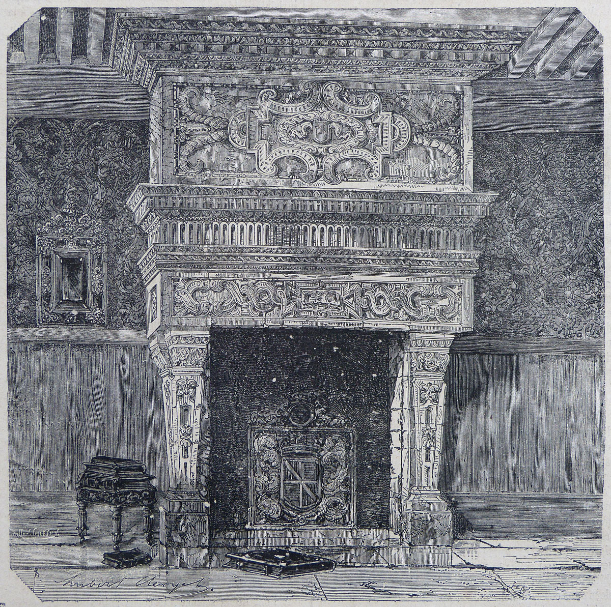 Vue d'une imposante cheminée de style renaissance au château de Launay, près de Lude dans la Sarthe. Cette très grande cheminée en pierre est richement sculptée, particulièrement son manteau décoré de trois grandes corniches. Une taque (plaque foyère) décorée d'un blason occupe le fond du foyer. Le sol de la pièce est couvert de grandes dalles de pierre, quelques livres sont disposés à proximité de la cheminée. Le plafond est à la française tandis que le mur est couvert de boiseries en partie basse.