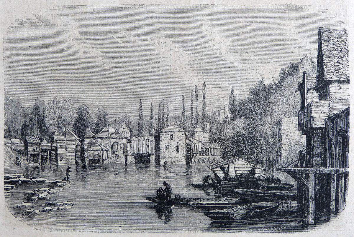Vue du quartier des tanneries au Mans avant sa démolition en 1869 pour cause d'insalubrité. On y voit des maisons en pierre et bois construites tout au bord de la Sarthe ainsi que les moulins à eau qui servaient pour le tannage. Au premier plan des barques et un atelier flottant. On devine à droite les vestiges de la fortification médiévale avec des mâchicoulis.