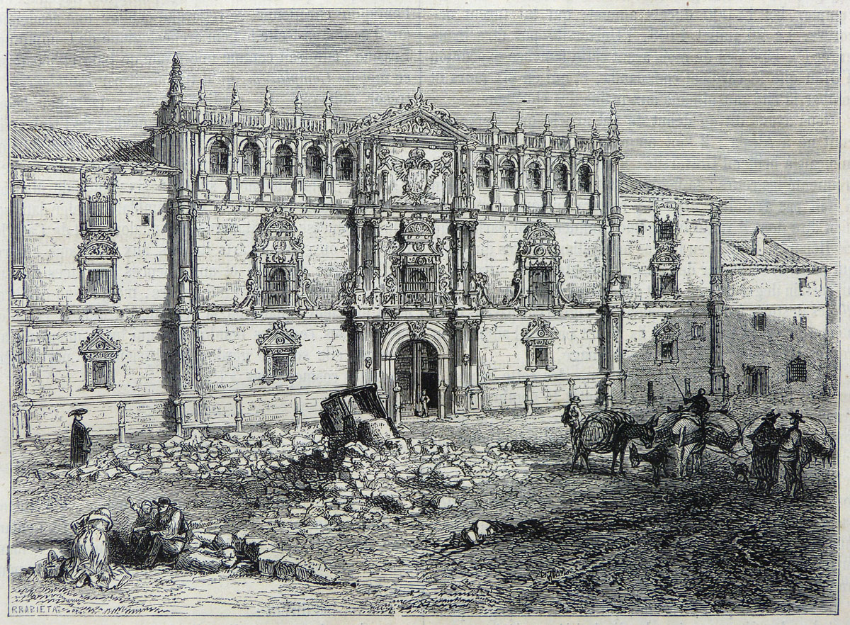 La façade du Colegio Mayor de San Ildefonso (Rodrigo Gil de Hontañón, 1543) dans un style renaissance. L’université d'Alcalá de Henares a été fondée en 1499 par le cardinal Francisco Jiménez de Cisneros.