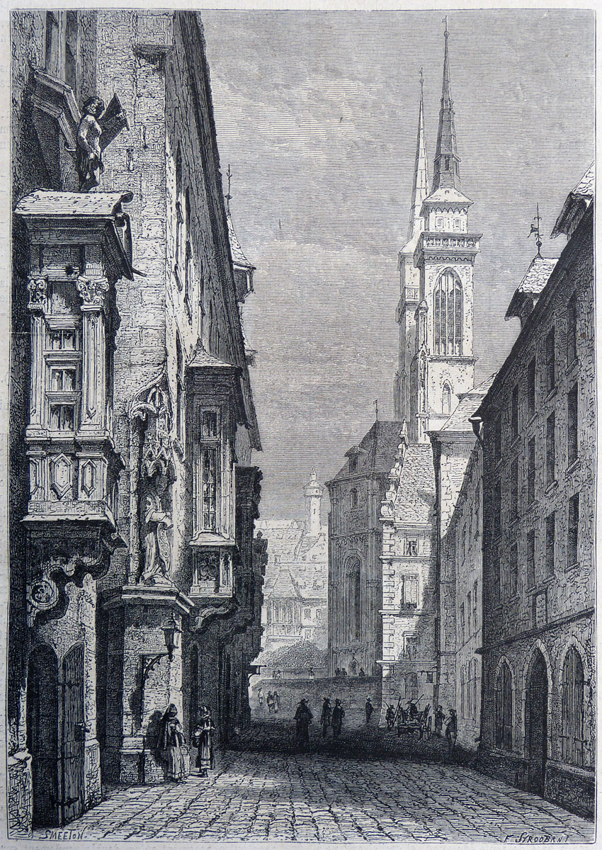 Vue d'une vieille rue de Nuremberg (Bavière, Allemagne). De part et d'autre de la rue pavée, des bâtiments anciens d'aspect médiéval et renaissance. A gauche, à l'angle d'une autre rue perpendiculaire, la statue d'un évêque sous un dais gothique. Au bout de la perspective on voit la façade principale et les deux tours XVe siècle de l'église Saint-Sébald essentiellement gothique.