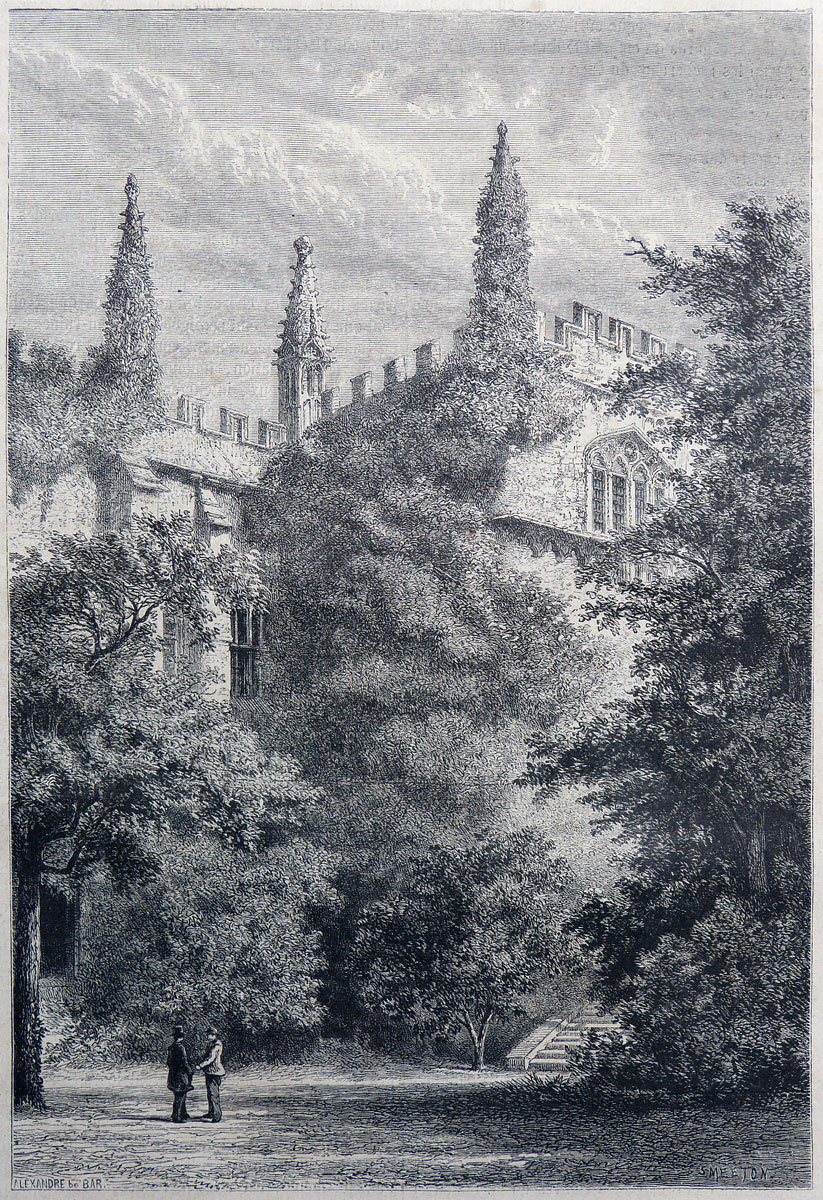 Le collège d'Exeter fait partie de la prestigieuse université d'Oxford (Royaume-Uni) en Angleterre. Le bâtiment visible ici sous la végétation date du XVIIe siècle, il s'agit de la "Bodleian Library" d'Oxford. Dans un style gothique anglais caractéristique, la façade est surmontée de créneaux et de pinacles. On devine une fenêtre gothique au centre. Le jardin dans un style romantique donne une impression de foisonnement et de désordre qui contraste avec l'aspect austère du bâtiment.
