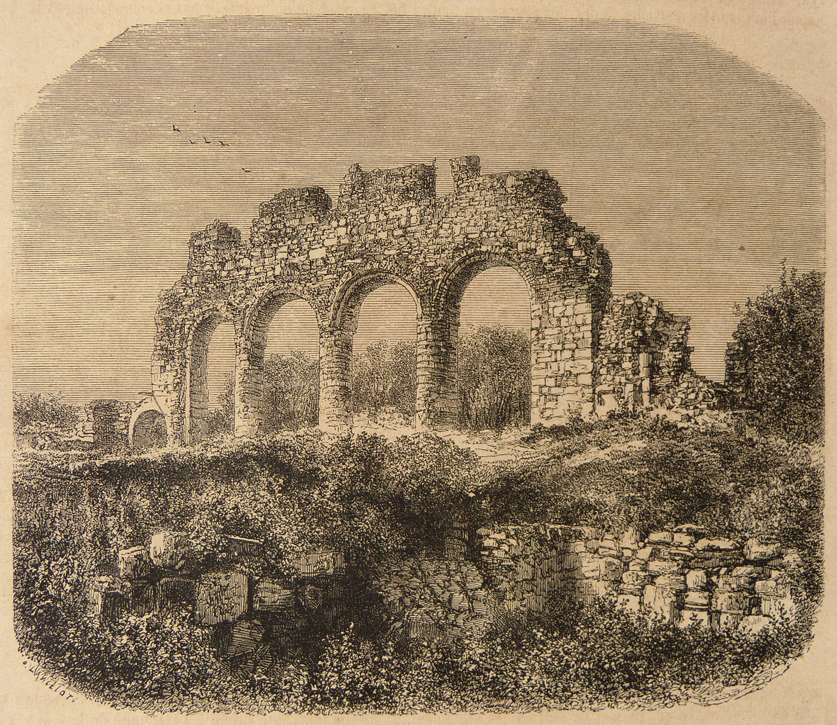 Ruines de la cathédrale de Hamar en Norvège. Cette cathédrale fut construite dans le style roman au XIIe siècle, puis convertie en style gothique ultérieurement. Détruite au XVIe siècle, il n'en reste qu'un pan de mur avec quelques arcades. La gravure nous la présente sous la forme d'une ruine romantique partiellement envahie par la végétation.