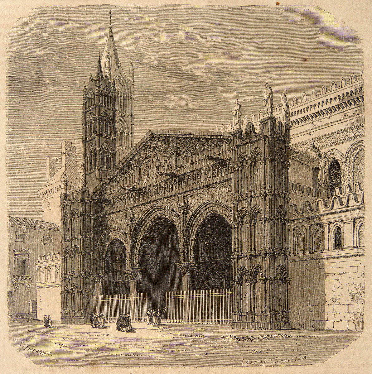 La cathédrale de Palerme est un édifice roman du XIIe siècle, de style arabo-normand caractéristique de la Sicile. Les sculptures du portail latéral sont attribuées à Domenico et Antonello Gagini. Il s'ouvre sur la place par trois grands arcs surmontés d'un fronton. Deux tourelles l’encadrent. On aperçoit en arrière plan les tours de la cathédrale. Cette architecture normande de Sicile, ou architecture arabo-normande est caractérisée par l'influence des cultures normande, arabe et byzantine après la conquête de la Sicile par les Normands.