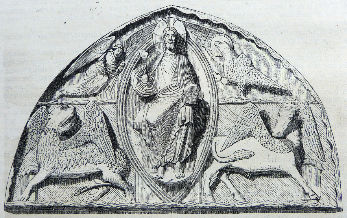 Le portail royal, bâti dans les années 1145-1150, a survécu à l'incendie de la cathédrale à la fin du XIIe siècle. A mi-chemin entre art roman et art gothique, son tympan représente le Christ en majesté entouré des quatre évangélistes symbolisés par le tétramorphe : Matthieu représenté par un homme, Marc par un lion, Luc par un taureau, et Jean par un aigle. Cette scène est issue du quatrième chapitre de l’Apocalypse.