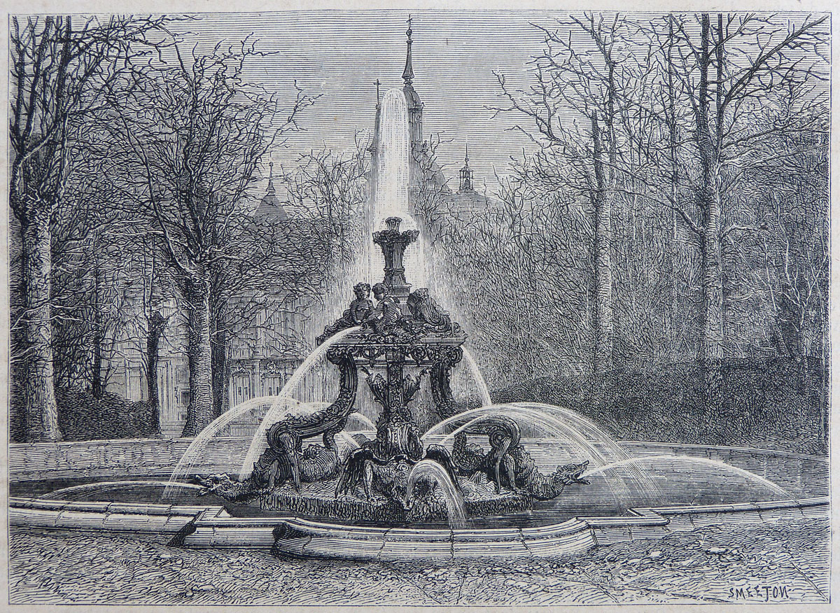 Vue d'une des vingt-six fontaines baroques du jardin de la résidence royale des rois d’Espagne à la Granja (San-Ildefonso). Au milieu d'un parc orné de grands arbres, une fontaine à la base de laquelle quatre dragons crachent de l'eau. En partie haute, quatre chérubins tiennent des vases d'où coule également de l'eau. En arrière plan, masqué par la pièce d'eau, la façade du palais royal.