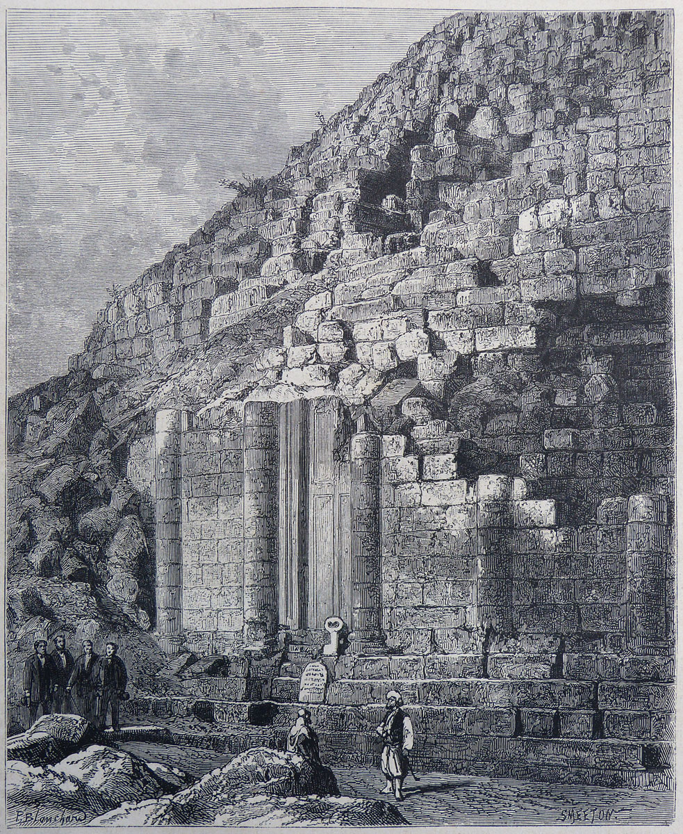 Vue d'une des portes du mausolée royal de Maurétanie, anciennement appelé tombeau de la Chrétienne. Ce mausolée d'époque numide, situé en Algérie à Sidi Rached, est un imposant tumulus d'environ soixante mètres de diamètre pour trente deux mètres de hauteur. C'est un monument de tradition locale influencé par la culture gréco-romaine. Il est inscrit au patrimoine mondial de l'UNESCO. En haut de quelques marches une fausse porte gravée dans la pierre, entourée de colonnes à demi ruinées. Devant le mausolée, deux Mauritaniens s'entretiennent. A gauche, quatre occidentaux en costume semblent prendre la pose.